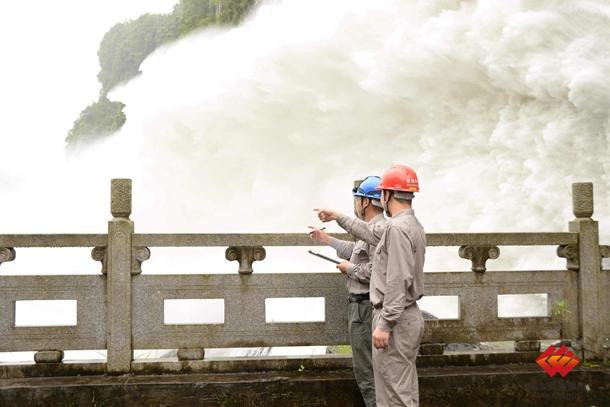 图为恩施水电公司老渡口水电站员工检查泄洪情况