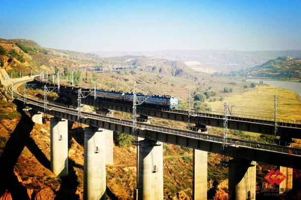 图为满载煤炭的列车驰骋在大准线黄河特大桥上