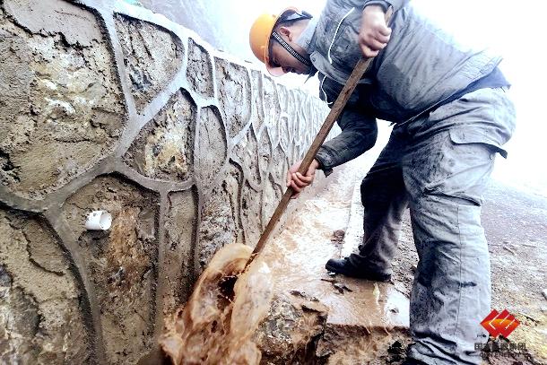 图为江西太阳岭风电场职工咋很足清理堵塞排水沟道