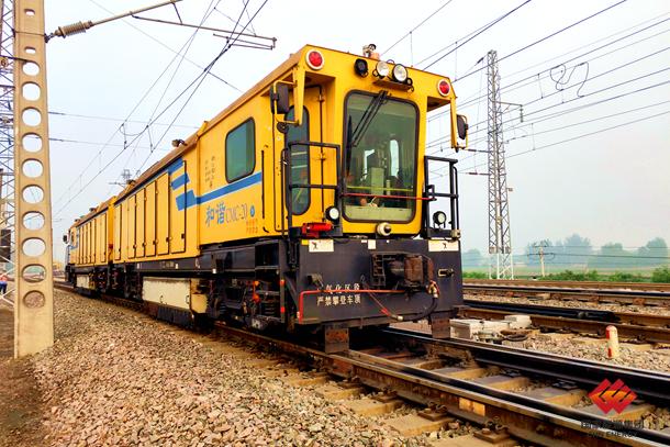 图为钢轨铣磨车正在对217号道岔进行打磨作业