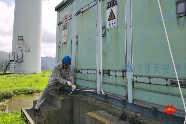 图为宁波风电公司运维人员对风电机组箱变进行加固