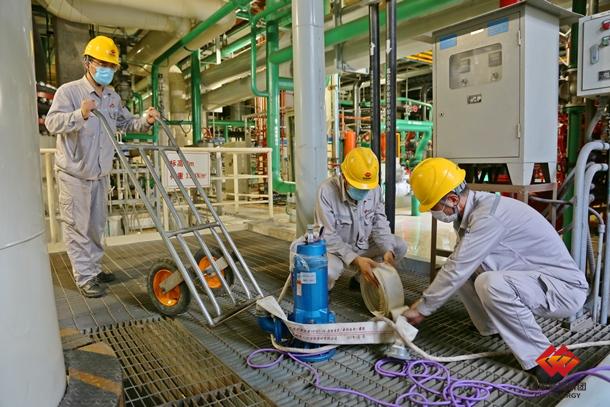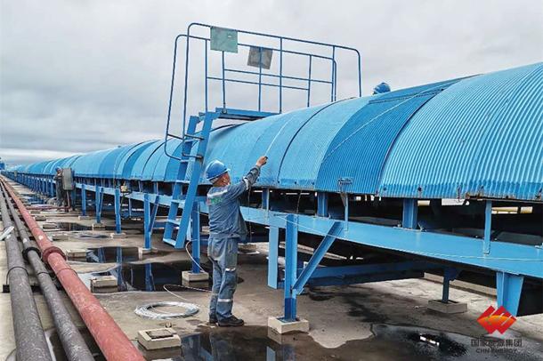 图为庄河公司员工正在用铁丝加固输煤防护罩