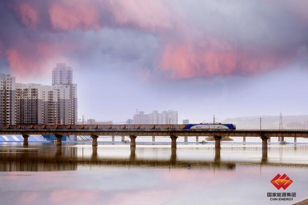 图为包神铁路运煤专列驶过美丽的乌兰木伦大桥