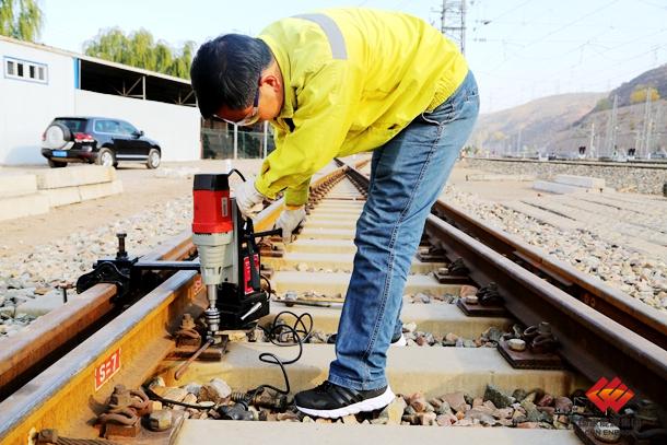 图为线路工正在使用该组合工具钻取岔枕折断螺栓