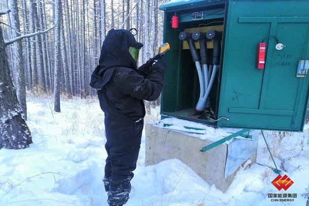 图为蒙东公司兴安风电场职工进行集电线路电缆分接箱电缆头测温