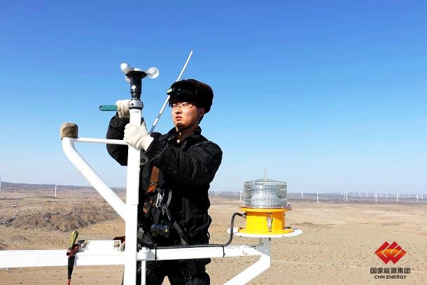 图为新疆公司布尔津风电场职工对风速仪进行校正