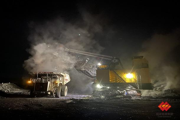 图为夜间露天煤矿生产现场电铲正在装车作业
