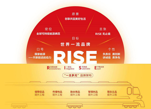 发布会上明确,国家能源集团RISE品牌战略表述为:树立RISE品牌理念,强化RISE品牌意识,实施RISE品牌工程,打造国家能源集团世界一流品牌。RISE单词的本义是崛起、增强、提升,同时也是RISE品牌战略中四个英文单词的首字母组合,R、I、S、E分别代表Revolutionary(改革创新)、Integrative(一体化)、Sustainable(可持续)、Equal(平等共享)。国家能源集团的RISE品牌战略模型,外形、颜色、寓意与集团LOGO一脉相承,以“旭日东升”为创意,契合集团发展阶段和企业特色,代表了集团品牌与企业文化一体两面,相辅相成,寓意源源不断、可持续发展的能源,体现了集团品牌的行业属性和发展形象。
