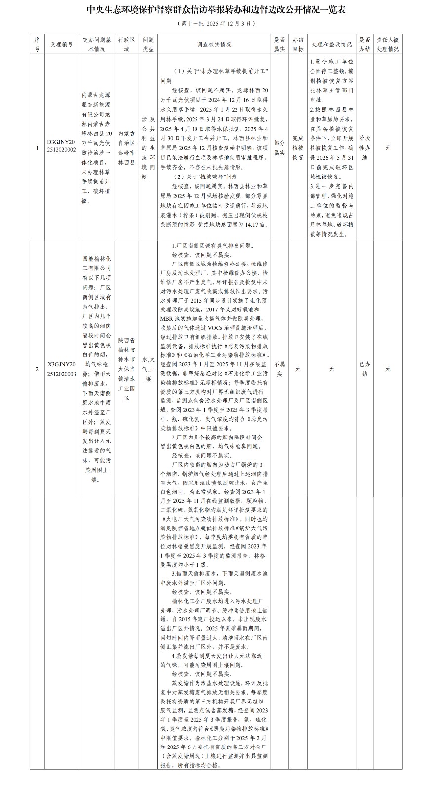 中央生态环境保护督察群众信访举报转办和边督边改公开情况一览表(第十一批 2025年12月3日)