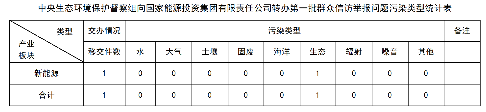 11月20日,中央第五生态环境保护督察组向国家能源投资集团有限责任公司移交第一批群众信访举报件1件,其中来电举报1件。