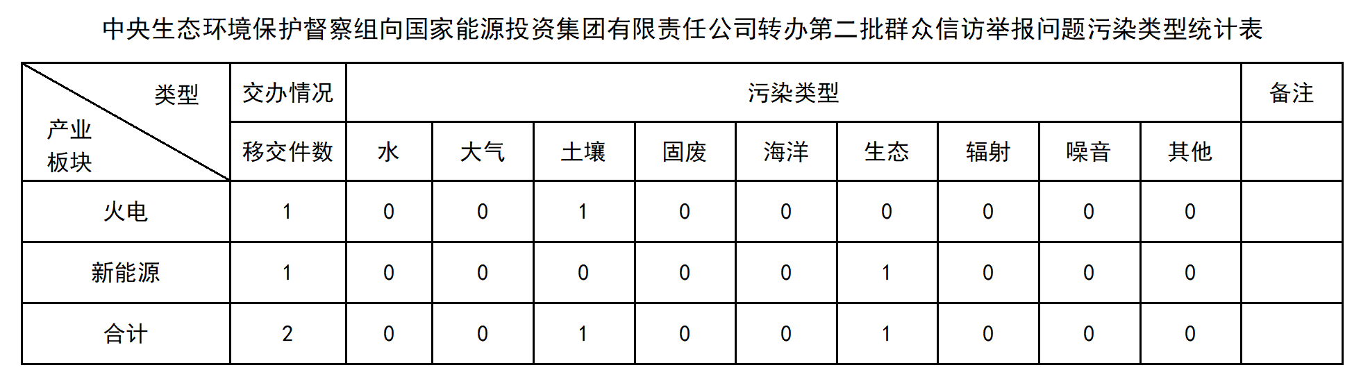 截至当日,国家能源投资集团有限责任公司已累计收到中央第五生态环境保护督察组交办的信访举报件3件。涉及生态环境问题3件,其中土壤1件、生态2件。所有举报件均已及时转交相关企业处理。