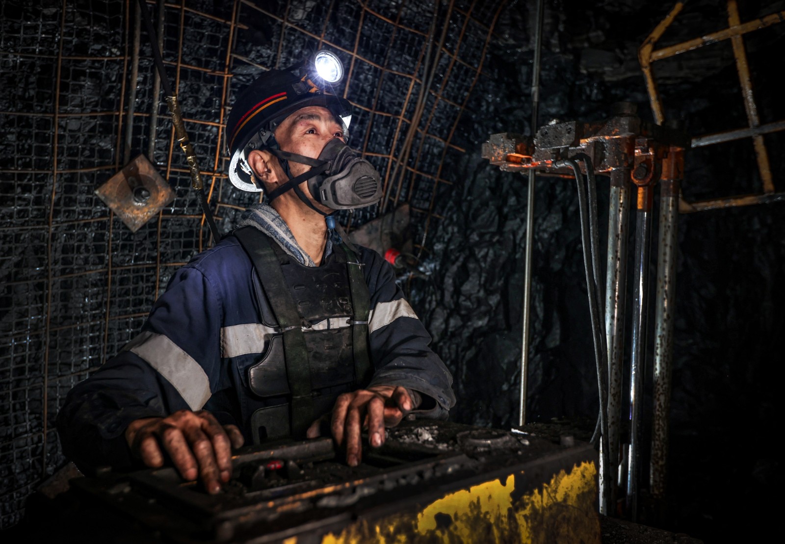 图为麦垛山矿职工操作锚杆钻机对巷道顶板进行支护作业