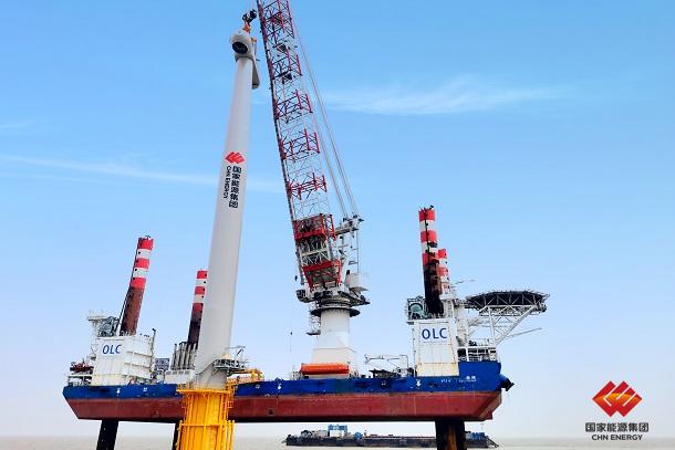 图为江苏海上公司射阳风电项目机舱吊装现场