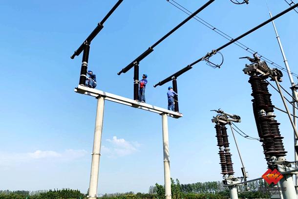 图为检修人员正在擦拭母线支持绝缘子
