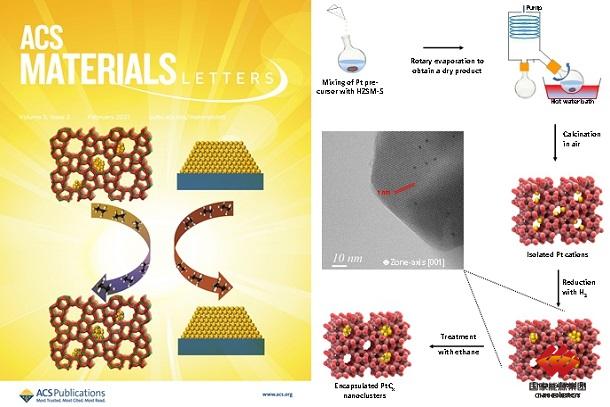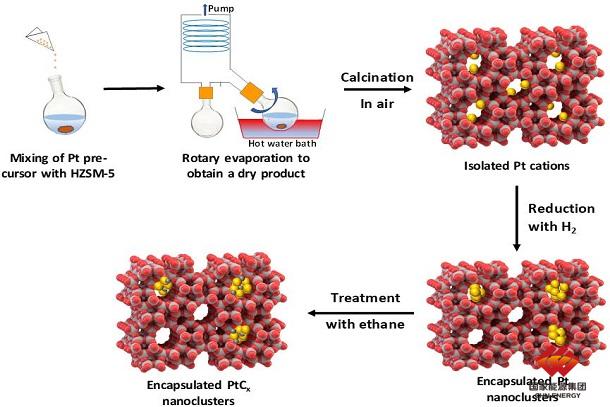 目前,分子筛包裹的金属铂纳米材料的制备方法,大多涉及到复杂的掺杂金属原子的分子筛合成步骤。低碳院北美研究中心通过简单的化学沉积、空气煅烧以及氢气还原处理就可以合成分子筛包裹的铂纳米颗粒,其大小在1纳米左右。此外,研发团队发现在高于300摄氏度的环境下,该材料经乙烷处理后,会转化为碳化铂纳米颗粒,但对于负载在氧化铝载体上的较大的金属铂颗粒,同一条件下经乙烷处理并不会产生碳化铂颗粒。