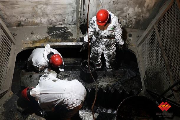 图为维修人员清理吊斗铲大齿圈齿段润滑油脂。