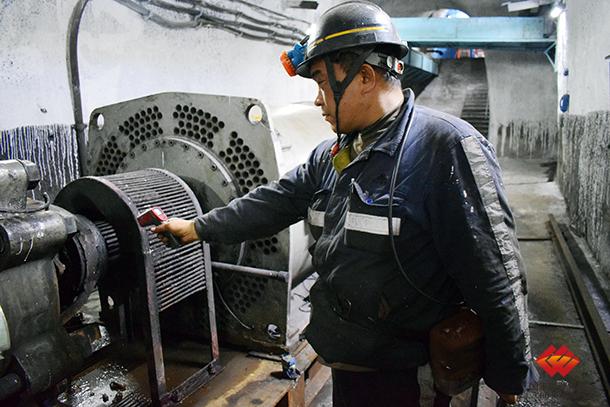 图为岗位工正在测量设备轴承温度。