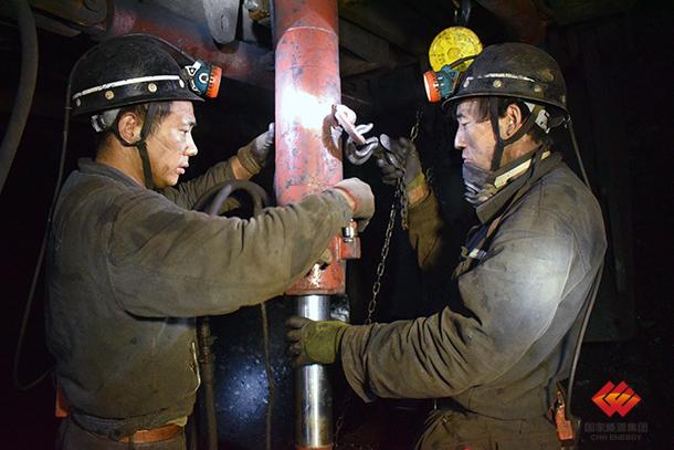 图为检修人员正在检修液压支架。