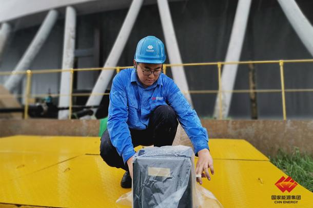 图为员工冒雨对室外热控接线端子箱加盖防雨布