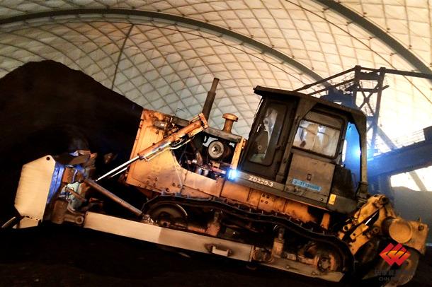 图为员工驾驶专业车辆修整堆垛煤山