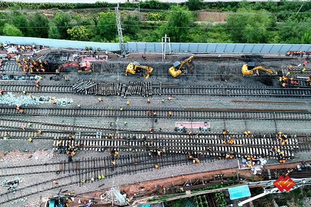 图为该公司3亿吨扩能府谷站大型换岔施工现场