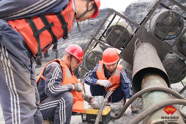图为检修人员正在对采场集水坑水泵线路进行检查维护