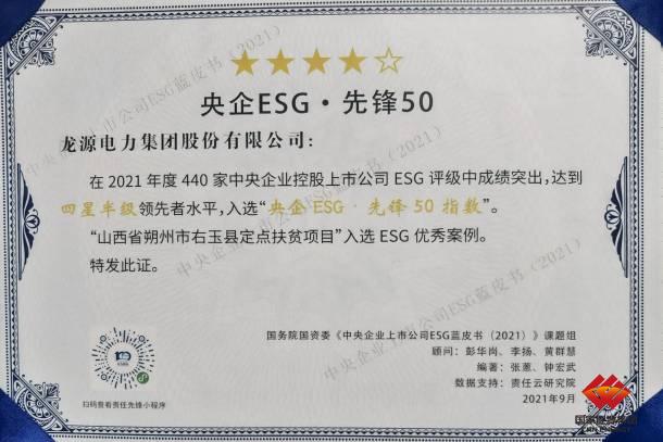 9月18日,在国务院国资委举办的“责任创造价值,责任引领未来——中央企业社会责任报告”集中发布活动上,国家能源集团龙源电力入选“央企ESG·先锋50指数”,其案例《山西省朔州市右玉县定点扶贫项目》入选国务院国资委《中央企业上市公司ESG蓝皮书(2021)》课题组颁发的ESG优秀案例。