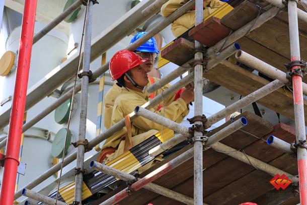 图为常州公司检修工对炉顶户外变送器的伴热电缆进行防风加固