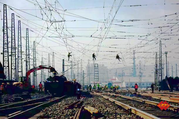 图为供电专业作业人员天窗检修接触网设备