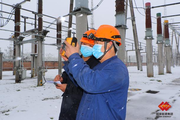 图为员工冒雪开展升压站设备敷冰融雪特巡检查
