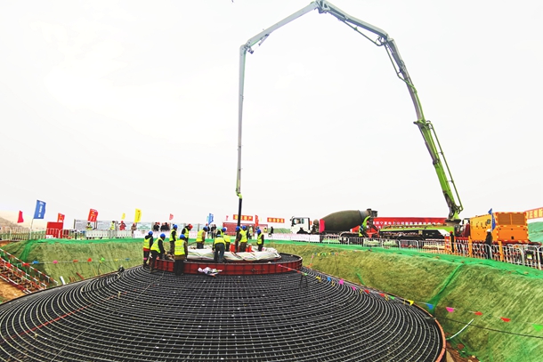 图为全国最大“沙戈荒”项目首台风机基础浇筑混凝土