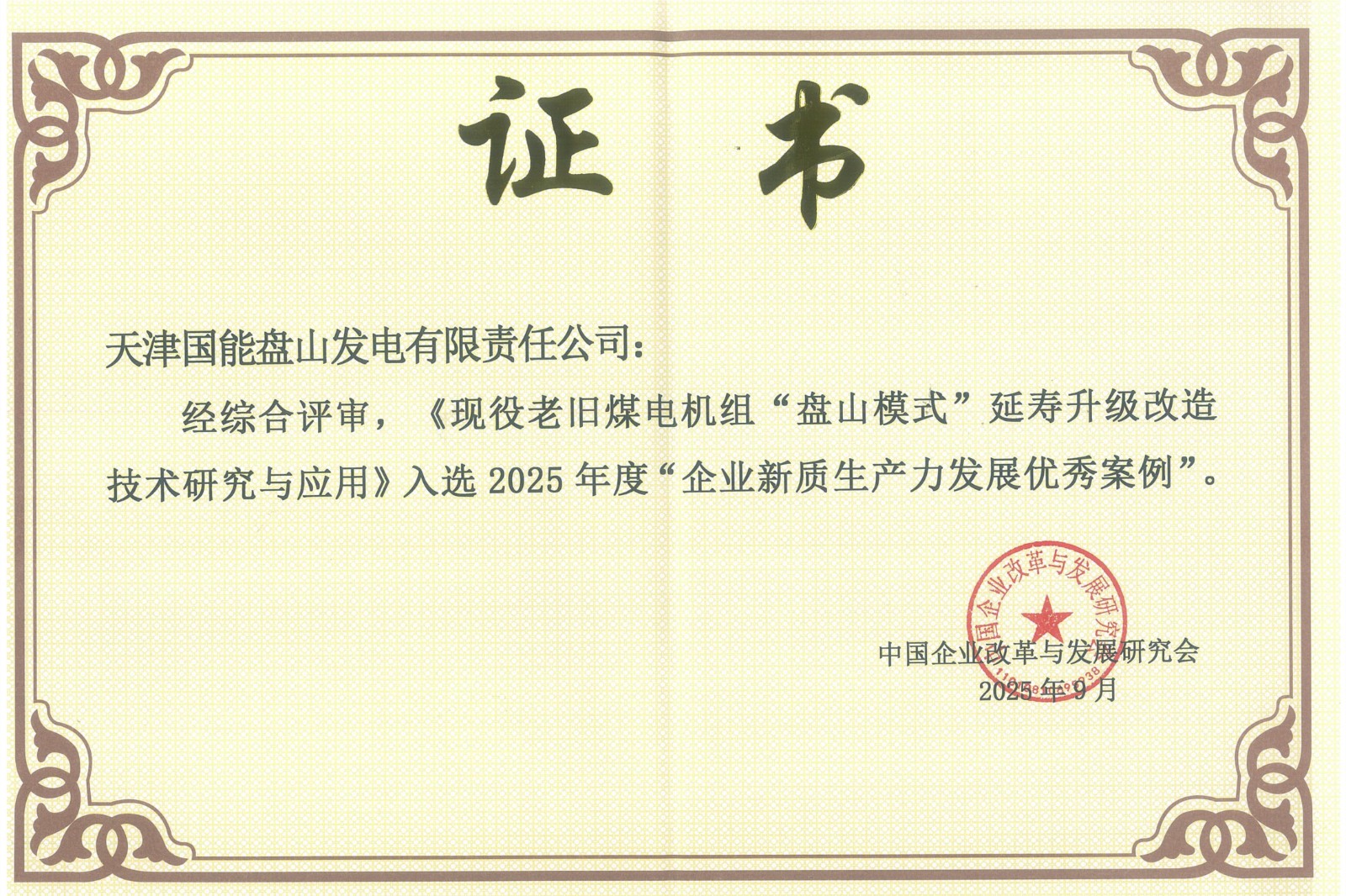 近日,天津公司盘山电厂申报的《现役老旧煤电机组“盘山模式”延寿升级改造技术研究与应用》经中国企业改革与发展研究会综合评审,获评2025年度“企业新质生产力发展优秀案例”。