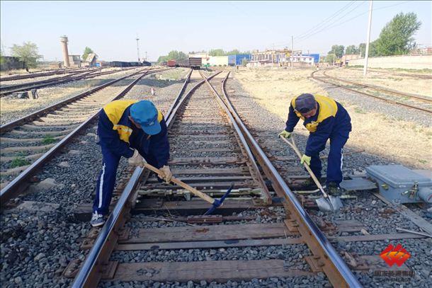 图为该运输公司员工正在清理道岔排水沟