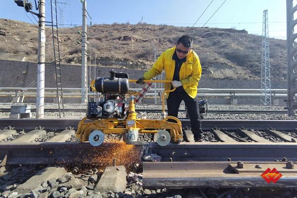 图为线路工正在进行打磨作业