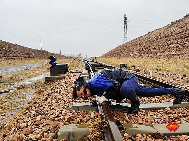 图文线路工正在观测轨道水平