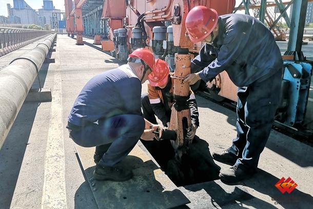 图为员工正在检查装船机防风拉杆