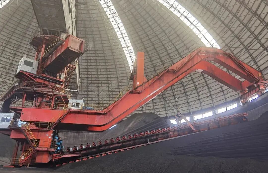 图为配煤一中心堆取料机正在进行原煤取料