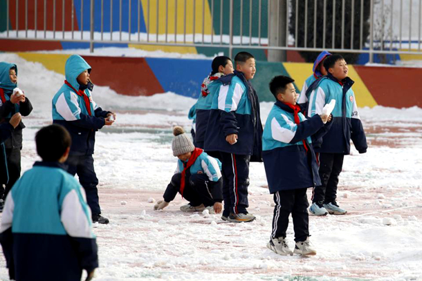 图为学生在新朔铁路捐建的标准化操场上打雪仗