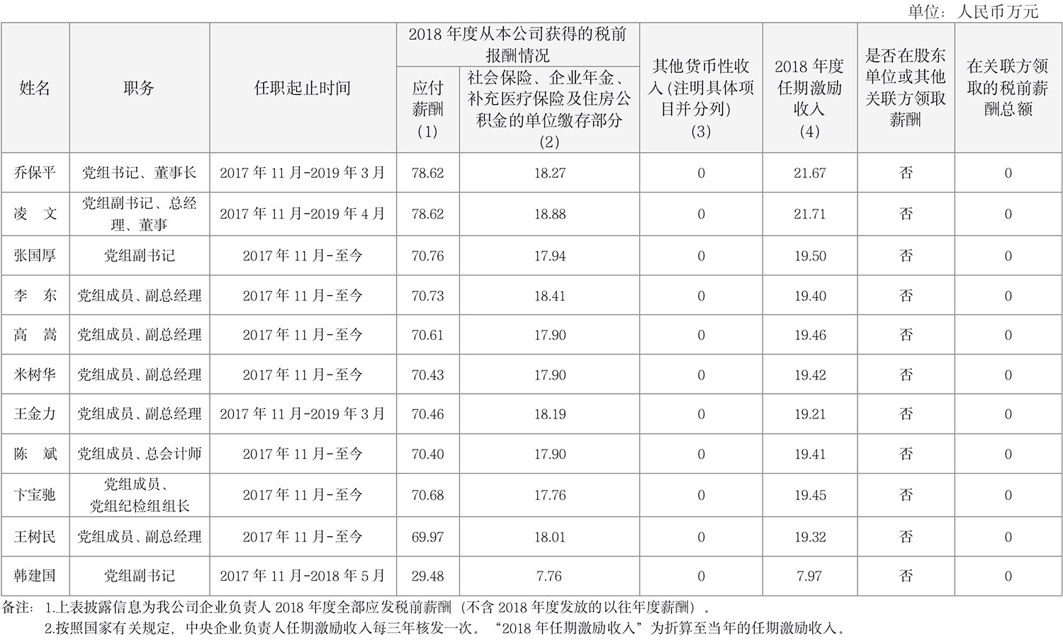 国家能源投资集团有限责任公司企业负责人2018年度薪酬情况