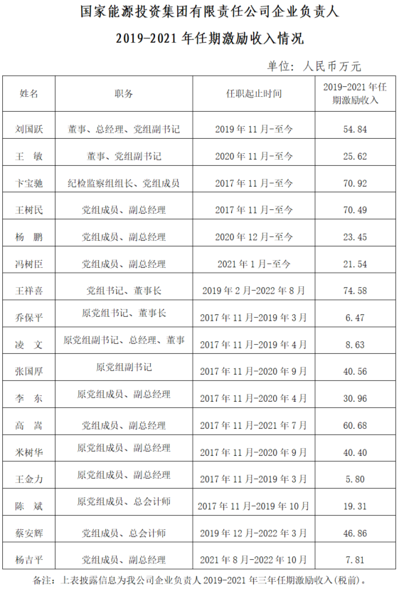 国家能源投资集团有限责任公司企业负责人2019-2021年任期激励收入情况