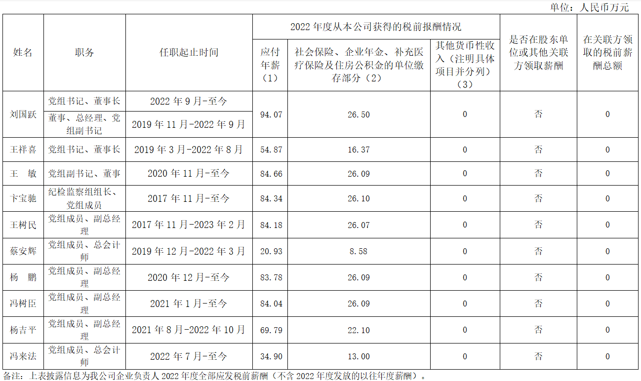 国家能源投资集团有限责任公司企业负责人2022年度薪酬情况