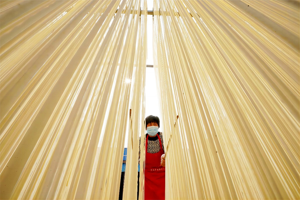 Workers at a handmade dried noodle factory in Wubu County are producing noodles